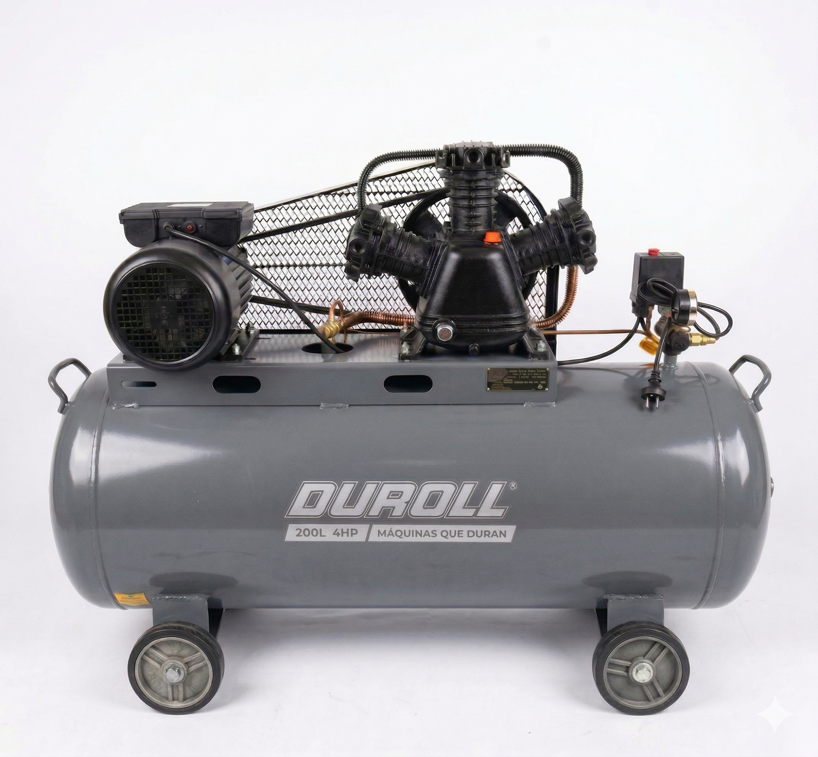 El compresor eléctrico tricilíndrico DUROLL CD04203M está diseñado para aplicaciones de uso profesional que requieren una buena capacidad de aire, reserva suficiente en tanque y un funcionamiento confiable para tareas de taller y trabajo intensivo.