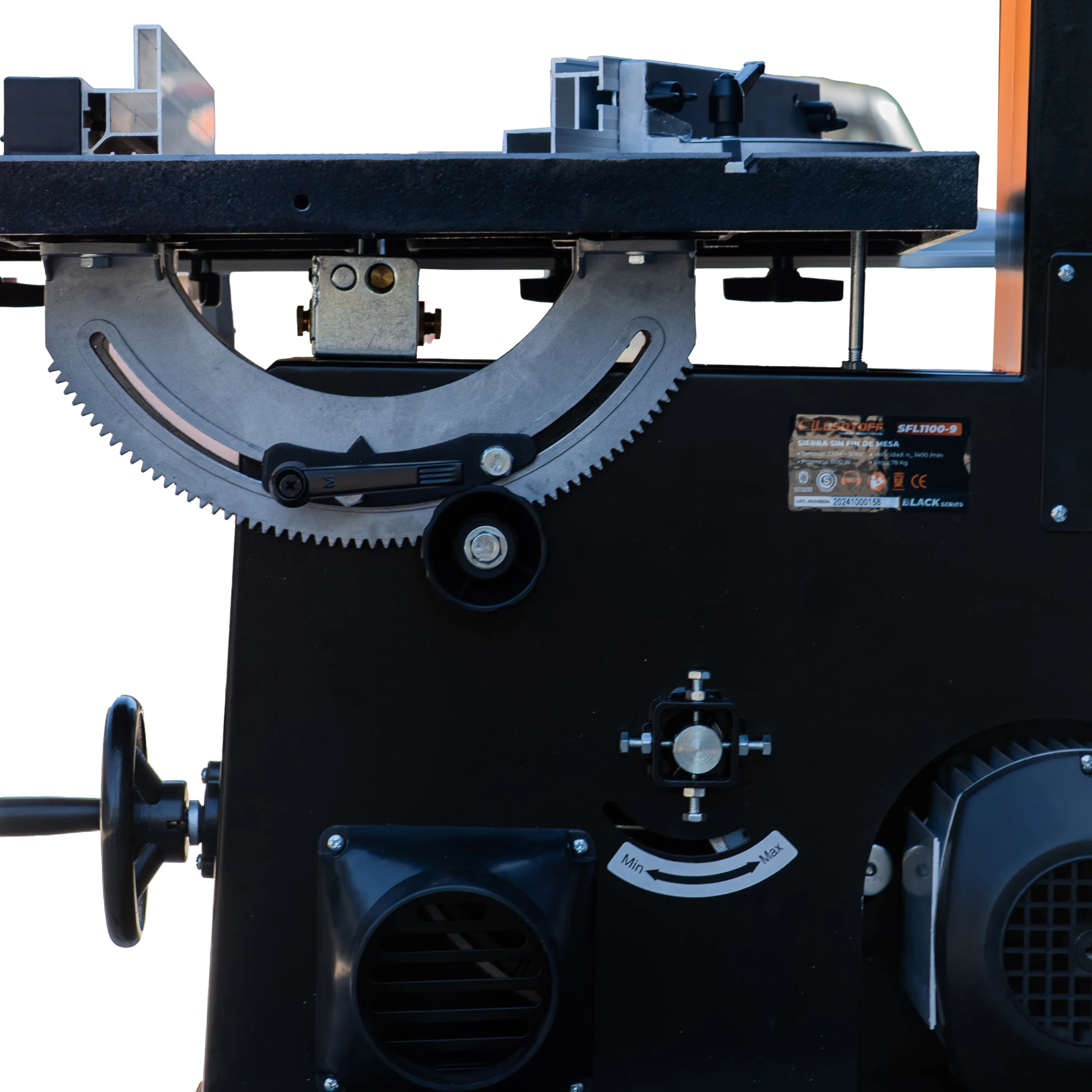 Su potencia de 1100W y velocidad variable de 370 a 750 m/min garantizan versatilidad de corte. Además, cuenta con ruedas de 315 mm, mesa regulable en ángulo y estructura sólida que permite trabajos exigentes sin esfuerzo.